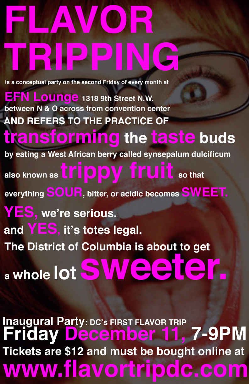 EFN will host DC’s first party for transforming the taste bud, an experience that will allow guests to twist their tongue on a West African berry called synsepalum dulcificum, or "trippy fruit." Trippy fruit temporarily re-wires taste receptors on the tongue, transforming acidic and sour food into sweet and enjoyable treats.