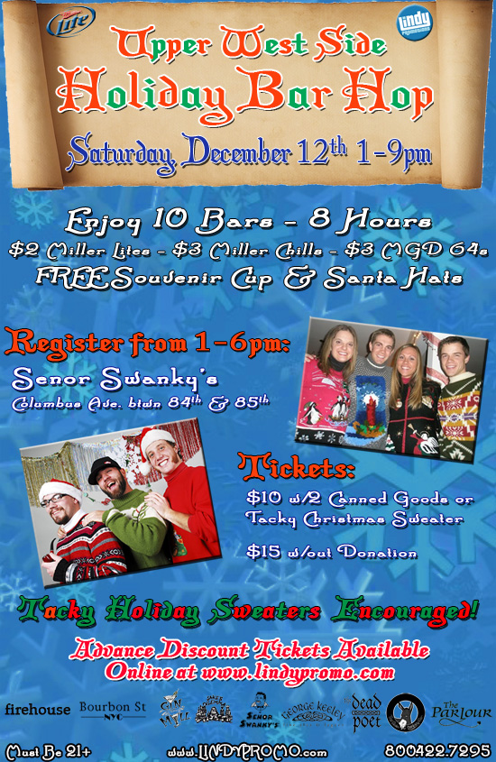 UWS Ugly Christmas Sweater Holiday Bar Hop-Put on that hideous Christmas sweater grandma gave you and join Lindy Promotions and Miller Lite as we spread holiday cheer by boozing and bar-hopping throughout the UWS...