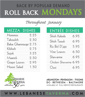 Back by popular demand, Lebanese Taverna is offering their original menu prices from 1979 on Mondays in January! It's a great deal - selected appetizers from $1.50 - $3.25 and entrees from $6.50 - $6.95. Make your reservation today!
