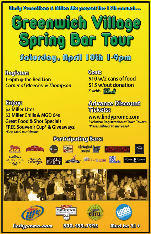 Join Lindy Promotions and Miller Lite as we celebrate the start of Spring and warm weather the best way we know how...day-drinking and bar crawling throughout Greenwich Village!