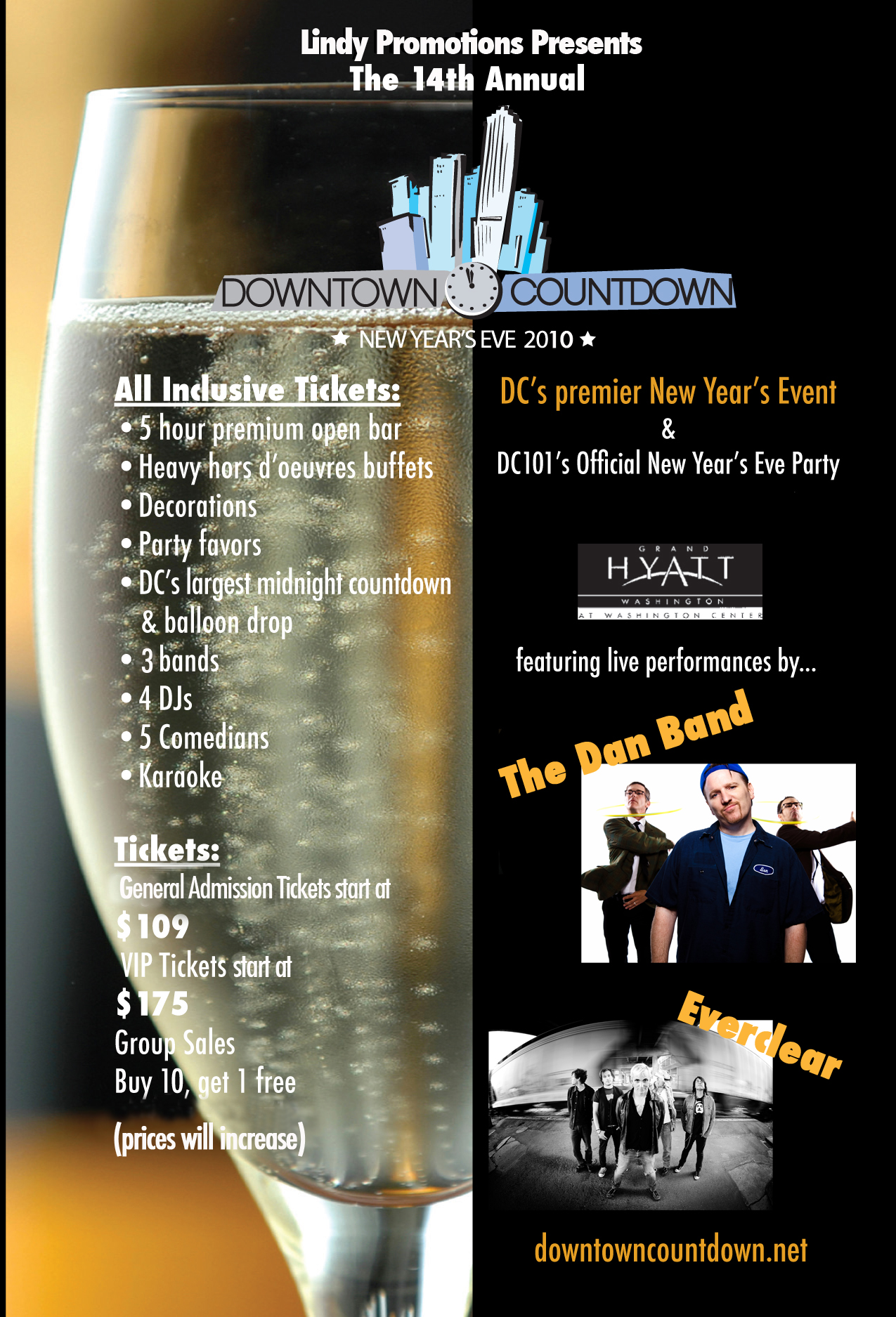 The 14th annual, “Downtown Countdown New Year’s Eve Gala” will return to the Grand Hyatt, Washington, and once again set the standard in live New Year’s Eve entertainment. After another sold out year in 2009, the Grand Hyatt will be the one-stop destination for your New Year’s Eve festivities, complete with a 5-hour premium open bar, hors d’oeuvres, multiple rooms of entertainment including 3 bands, 4 DJs, 5 comedians, dancing, karaoke, and DC’s largest midnight balloon drop.