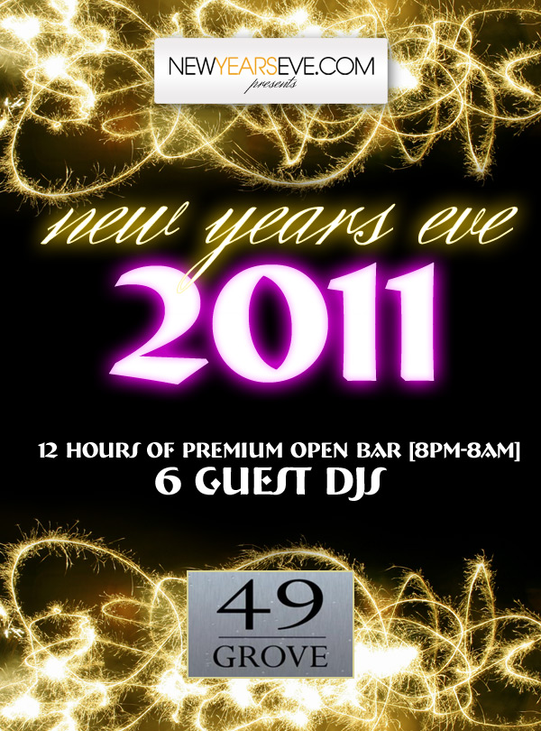49 Grove is having its annual New Year’s Ball 2011 which includes premium top shelf open bar, hors d’oeurves, and 6 Guest DJ’s playing a mix of House, Dance, Disco, 80’s and Hip Hop. Enjoy a champagne toast at midnight and party the night away in style. A breakfast buffet is also available, so be sure to dig in after a night of fun.