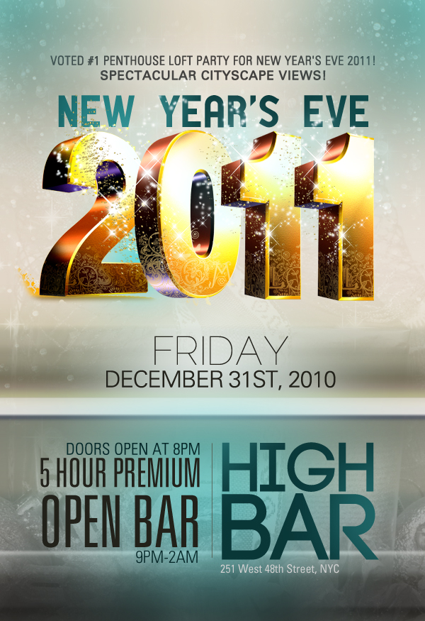 - Complimentary admission to The Official NYE 2011 After Party at (TBD) starting at 2AM. (A $35 value – FREE with your Highbar ticket stub!)