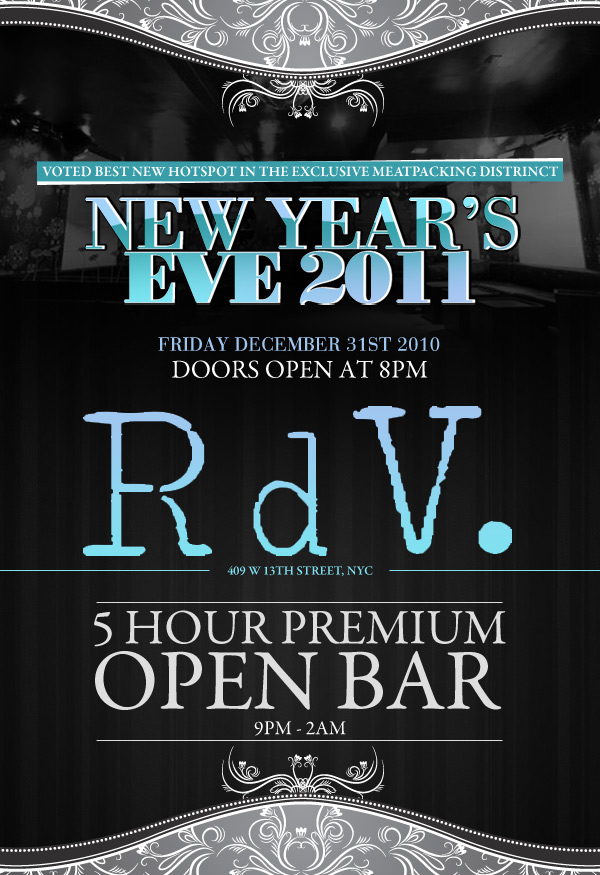 A fabulous New Year’s Eve 2011 fete is at your beckon call so whether you’re an amorous twosome or single out with friends ready to mingle (or anything in between), RdV provides the best and finest elements for a debaucherous night of New Year’s Eve revelry at its finest. NYE 2011 highlights include: