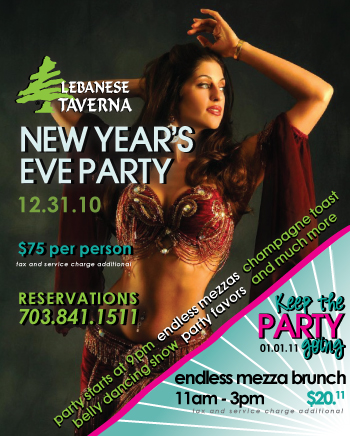 Lebanese Taverna Baltimore will be hosting “Mezza Madness” a Middle Eastern dim sum style dinner on New Year’s Eve. The party start at 9pm with servers continuously offering over 20 different mezzas (appetizers) including such favorites as hommos, chicken kabobs, kafta and shrimp Arak. Middle Eastern dessert will also be presented. Champagne toast, party favors and belly dancing shows will complete the night. Price is $75.00 per person plus tax and service charge. Reservations are required by calling 703 841 1511. From 5-7pm on New Year’s Eve, Lebanese Taverna Baltimore will be offering the a la carte menu.