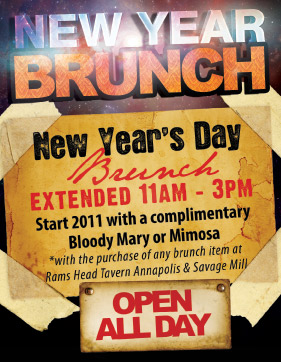 Start 2011 with a complimentary Bloody Mary or Mimosa with the purchase of any brunch item at Rams Head Tavern Annapolis or Savage Mill! * Must be 21+