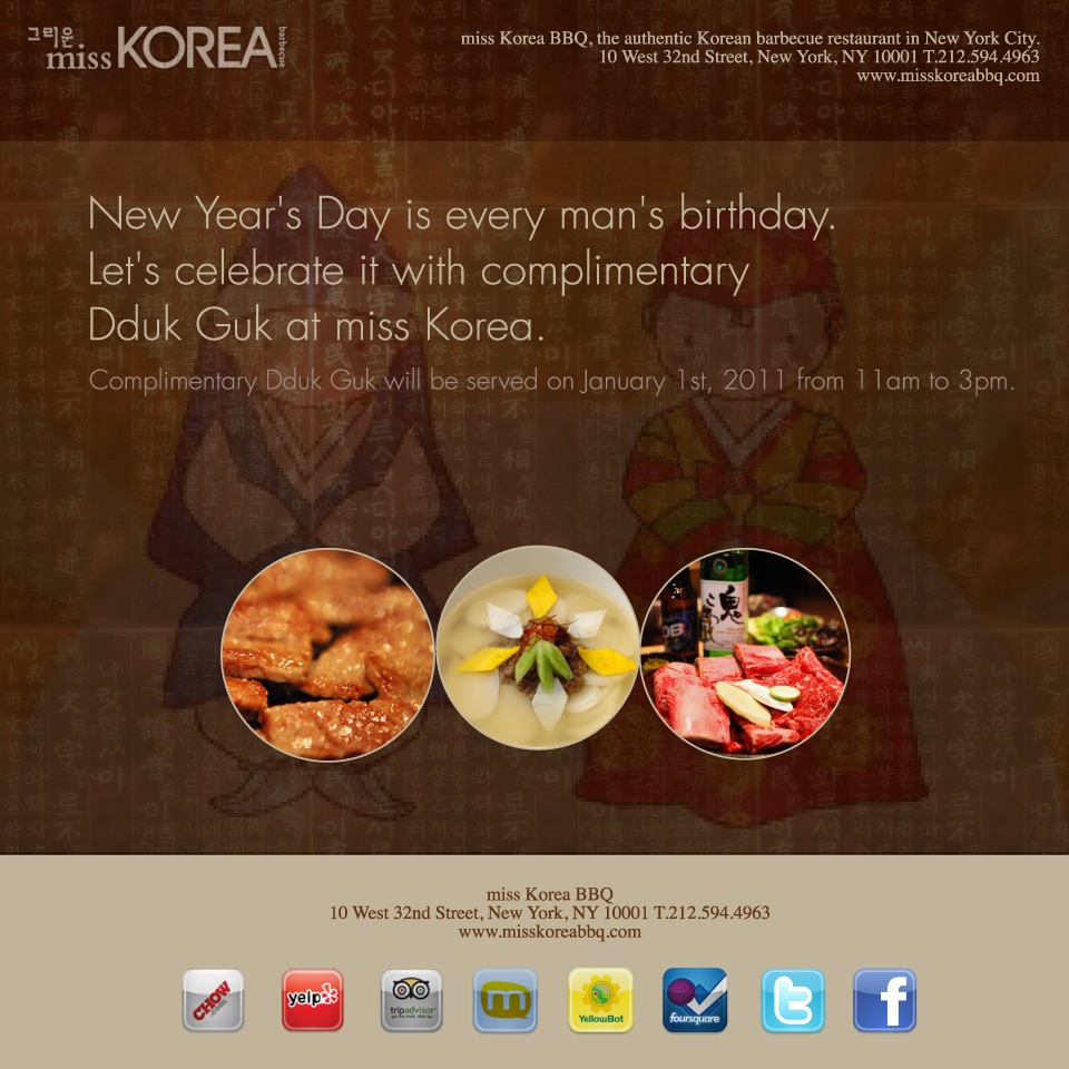 Complimentary Dduk Guk will be served on January 1st, 2011 from 11am to 3pm.