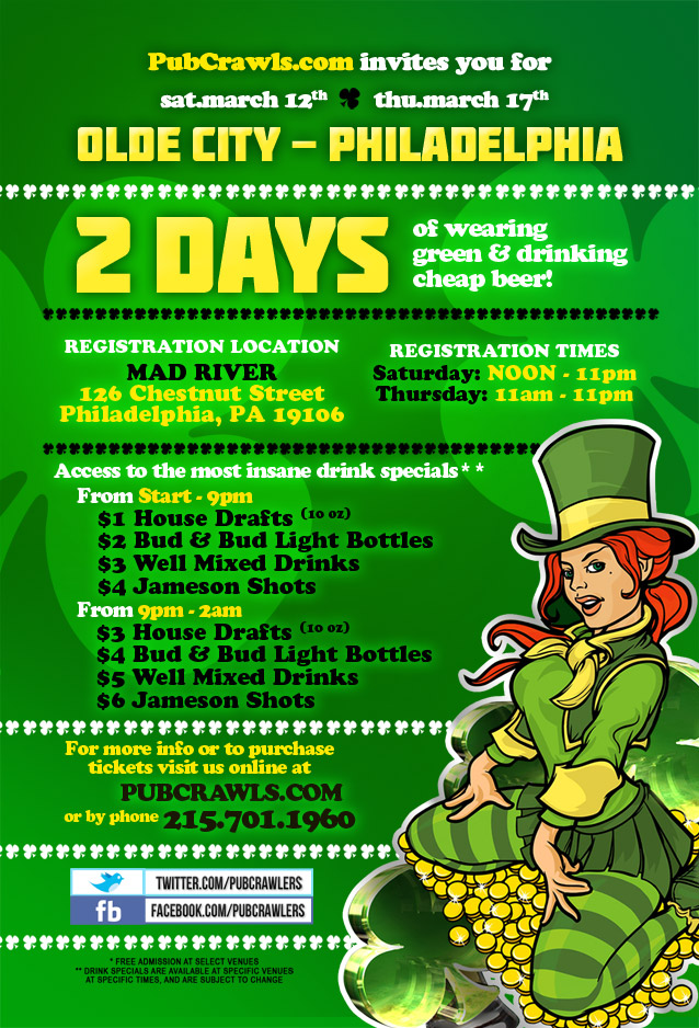 The Philadelphia 2011 Pub Crawl is going to be one of the biggest events of the year and you definitely do not want to miss out! The “City of Brotherly Love” is known for its camaraderie and hospitality, and what better way to bring people together than with booze and laughs? Once a year, many bars participate in this festive Saint Patty’s Day event, where a sea of people dressed in green all hop around their favorite local pubs and bars, partaking in the various drink specials everyone is more than happy to consume! Philly is known for having some of the best local watering holes for beers and brews, and you certainly don’t want to miss out on this wonderful Pub Crawl experience to see all that Philly has to offer this Saint Patty’s Day! So be prepared to be Irish for a day and buy tickets early in order to save and get the most out of your money. Bring your friends together in the beautiful old city of Philadelphia and come together for a truly entertaining Pub Crawl event that you will remember for years to come!