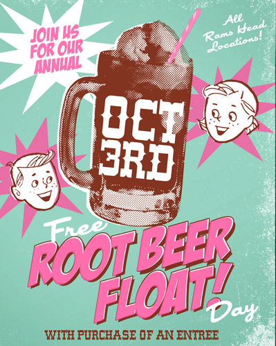 At any Rams Head restaurant location from 11am-11pm on Monday, October 3rd the locally owned restaurants will be scooping out free Root Beer Floats, featuring Vanilla ice cream and Old Dominion root beer.