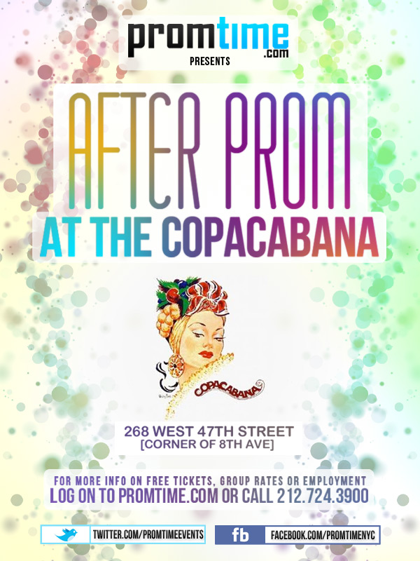 Once again, Copacabana is looking to produce one of the most talked about After Prom events in 2012! The name fits the bill at this Latin and tropical themed venue, and the entertainment is unparalleled. When it comes to the phenomenal aesthetics of this venue, from the state of the art sound system, to the unique lighting, makes it one of the most sought after in New York City for after prom parties. Copacabana's goal is to please, and this highly anticipated After Prom event is a once in a lifetime experience that you and your closest friends just can't miss. Just imagine, pulling up in your stretch limo and getting ready to party like an A-list socialite! It's some that you must experience!