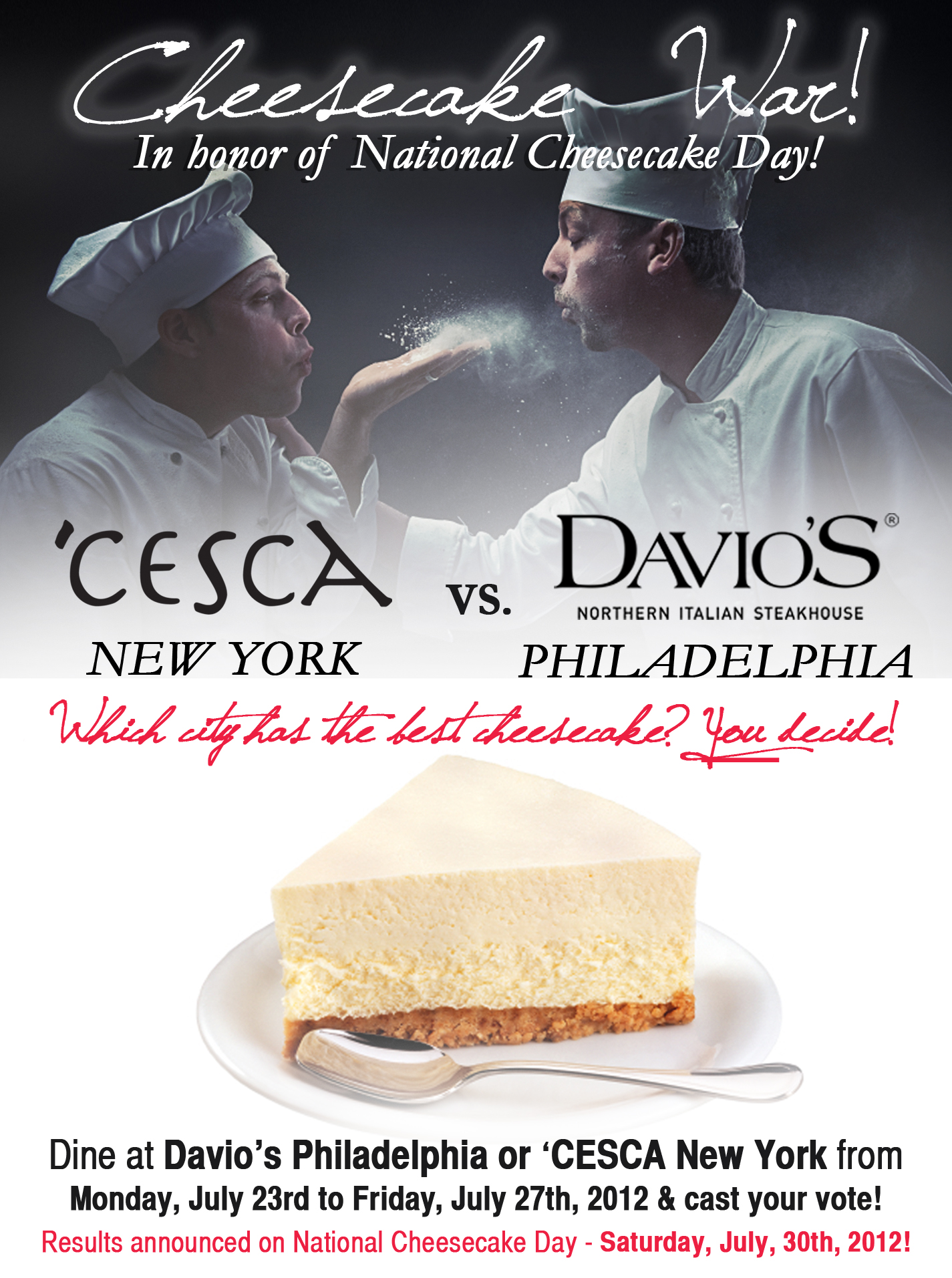 The Cheesecake War Dessert special is $10.00 and is available July 23rd, 2012 – July 27th, 2012 during dinner service only at ‘CESCA located at 164 West 75th Street, New York, NY. Phone: 212-787-6300 Web: http://cescanyc.com/ and at Davio's Philadelphia located at 111 South 17th Street, Philadelphia, PA. Phone: 215-563-4810 Web: www.davios.com.