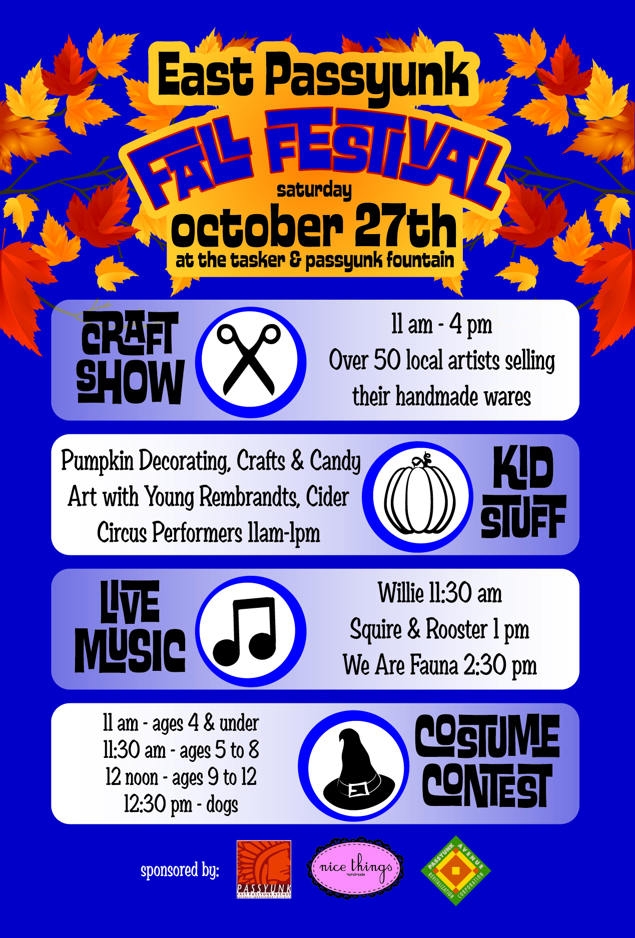 Enjoy a double dose of free fall fun with Spooky Saturday and Fall Festival. East Passyunk Avenue BID presents live bands, seasonal food and drink, costume contests, live music, circus performances, trick or treating, pumpkin painting, cider, pet treats, art lessons, vendors, craft show and more. Participating businesses: Nice Things.. Handmade, Ms Goody Cupcake, Stateside, Alphabet Academy, Charm City Movement Arts, Urban Jungle, more.