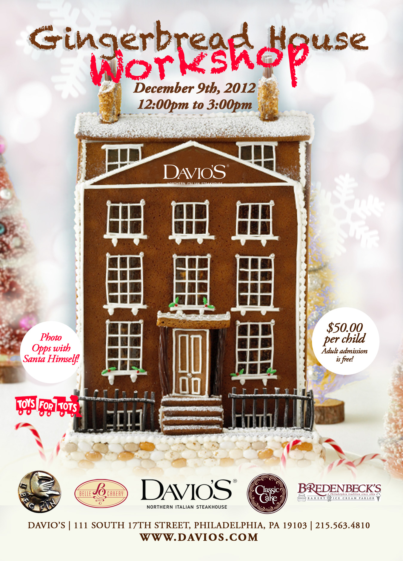 his holiday season, Davio’s Philadelphia is throwing a house party. A gingerbread house party, that is! Children of all ages are invited to participate in a one-of-a-kind workshop with some of Philadelphia’s renown pastry chefs including chef Robert Bennett of Classic Cake, chef Jennifer Smith of Le Bec Fin, chef Jessie Prawlucki of Belle Cakery & FOND and chef Diana Anello Bredenbeck's Sugar Artist! Join pastry chef Thomas Heck of Davio’s Northern Italian Steakhouse to lead a demonstration and workshop, teaching guests how to build personalized gingerbread houses fit for the North Pole! The event is $50.00 per child, and adult admission is free. Each participating child will receive one gingerbread house to decorate (with delectable decorations included courtesy of Nuts to You, a buffet lunch, and the chance to meet Santa, himself, for some photos!