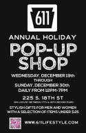 Don’t miss this last minute holiday shopping opportunity as iconic Philadelphia brand, 611, brings its full collection to life at their annual holiday pop-up shop. Starting Wednesday, December 19th through Sunday, December 30th, 611 will transform a vacant Rittenhouse Square garage into a unique retail boutique. Open daily from 12PM to 7PM, pop-up shop visitors will find fashion-forward apparel and accessories from 611’s “DJ Life” and “Luxe Life” collections, as well as never before seen spring 2013 items.