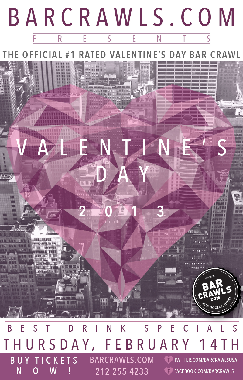 It's the most controversial Holiday out there. Valentine's Day can bring a lot of pressure whether your in a relationship or single and ready to mingle. Forget about your relationship status for a night and just go out and have fun with us!This NYC Valentine's Day crawl will be happing in all your favorite Midtown East/Murray Hill bars. There's nothing we love more than drink specials, bumping tunes, and night out on the town! Who knows who you might run into when your just out having fun!