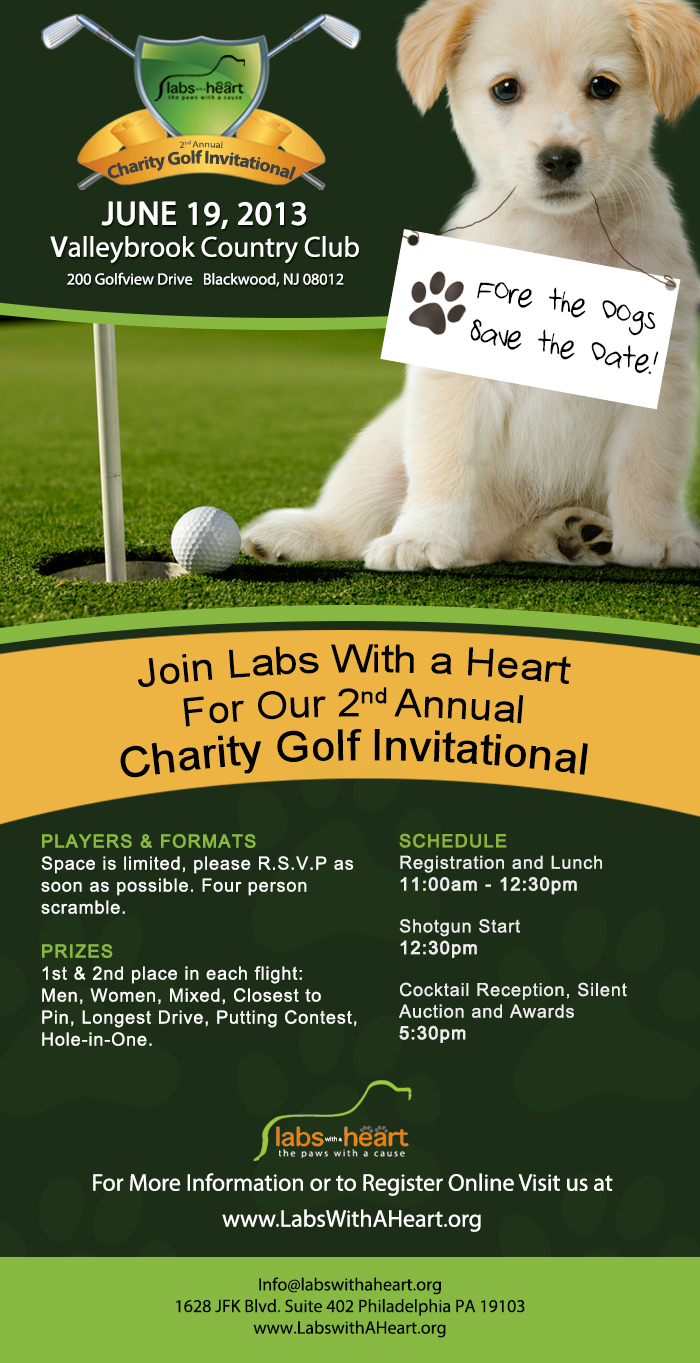 The Labs with a Heart organization has joined forces once again to host the 2nd Annual Charity Golf Invitational at Ron Jaworski’s Valleybrook Country Club in Blackwood, New Jersey.  An 18-hole, four person scramble, the tournament kicks-off with a lunch and registration on Wednesday morning, June 19, at 11:00am, with the shotgun start at 12:30 pm. Followed by a cocktail reception with heavy hors d’oeuvres stations, silent auction, raffle & awards.  Labs with a Heart will award prizes for Longest Drive, Closest to the Pin, Men’s flight, Women’s flight and more!  Register for the day’s festivities at www.labswithaheart.org.