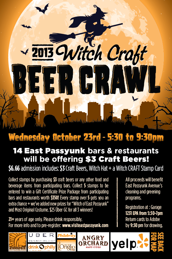 Grab your broomstick and fly around East Passyunk Avenue Business Improvement District (EPABID) during the fourth annual Witch CRAFT Beer Crawl on Wednesday, October 23, 2013, from 5:30pm to 9:30pm. Enjoy seasonal craft beers bubbling up in cauldrons at a record-setting 14 bars and restaurants. Tickets are $6.66 and include $3.00 craft beers, a witch hat and a Witch CRAFT stamp card. Earn a stamp by purchasing a craft beer, food or other beverage at participating locations. Collect five or more stamps to be entered to win a gift certificate prize package worth $350.00. Scare up your finest witch’s garb for a chance to win title of “Witch of East Passyunk” and “Most Original Costume.” Passyunk Gardens will cast its own spell with natural witches brew and other tricks and treats. Registration takes place at newly opened Garage (1231 EPA) from 5:30pm -7:00pm. Thanks to Witch CRAFT sponsors Boston Beers, Origlio Beverage, Drink Philly, Philebrity, Pretzel Crisps, UBER and Yelp. Tickets are on sale now at www.bit.ly/passyunkwitch. Proceeds benefit EPABID's cleaning and greening programs.
