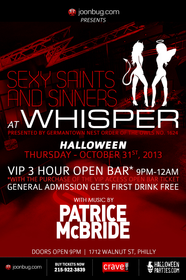 Let go of your inhibitions with the Sexy Saints & Sinners at Philly’s hottest nightclub, Whisper. The party will begin at 9pm and lasts 'til the wee hours, enough time for you to fulfill your naughtiest Halloween fantasies. You have the option to choose from the cash bar or the VIP open bar ticket, which will keep intoxicating libations traveling your way from 9pm to 12am. Either way, your complimentary first drink is on us! The live DJ will be spinning open format sets throughout the wicked Halloween night. Halloween enthusiasts and addicts have a selection of bottle packages to choose from, each with increasing levels of irresistible party hospitality.