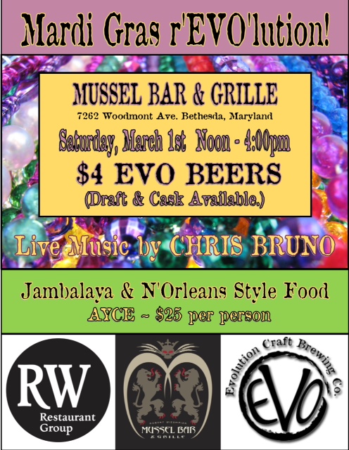 Join the r'EVO'lution and celebrate Mardi Gras with us at Mussel Bar & Grille on Saturday, March 1st 12-4pm! Enjoy $25 ALL YOU CAN EAT JAMBALAYA and other New Orleans dishes! $4 EVO beers will also be on special and live music by Chris Bruno.  Seating is first come, first serve.  Call for more information.