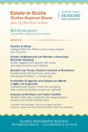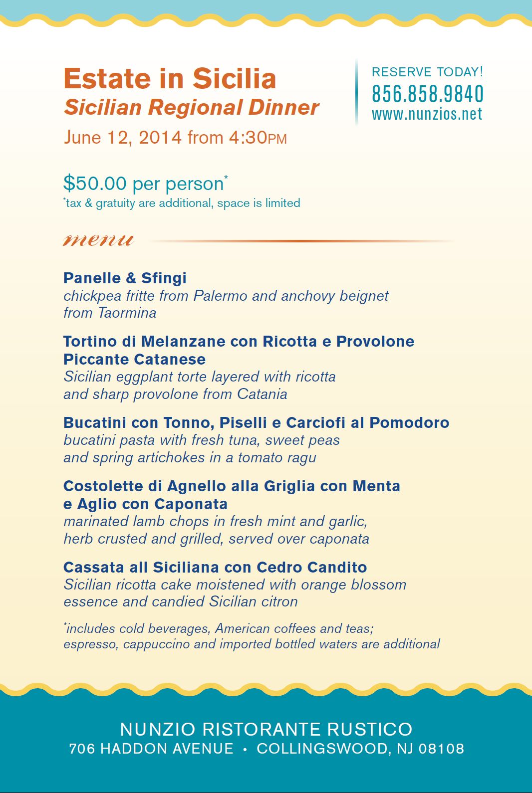 Chef Nunzio Patruno brings his Italian heritage to life in his “Estate in Sicilia” regional dinner, taking place on June 12th. For $50.00 per person, plus tax and gratuity, diners will enjoy a traditional five- course Sicilian meal. Chef Nunzio begins the experience with Panella & Sfingi, followed by Tortino di Melanzane con Riccota and a variety of other savory, Sicilian dishes. Included in the prix-fixe menu are cold beverages, coffee, and tea. Espresso, cappuccino, and imported bottled waters come at an additional price.