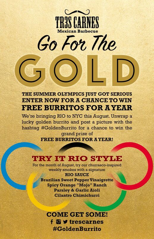 We're bringing Rio to NYC for the entire month of August. That's right the Olympics just got serious! Lucky winners can unwrap special gold covered burritos and enter for their chance to win a FREE BURRITOS FOR A YEAR! ‪#‎GoldenBurrito‬