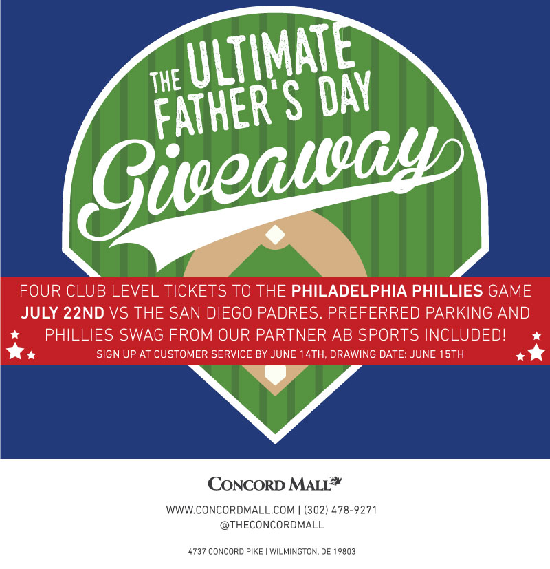 Enter to win the Ultimate Father’s day Giveaway at the Concord Mall! Four club level tickets to the Philadelphia Phillies game on July 22nd vs the San Diego Padres. Preferred parking and Phillies wag from our partner, AB Sports included!