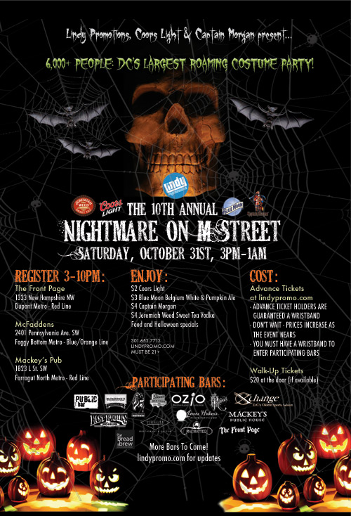 Over the past decade, Nightmare on M Street has become DC's largest roaming costume party, drawing people from up and down the east coast. This Saturday, October 31st, join Lindy Promotions, Coors Light, and thousands of Washingtonians once again for the 10th Annual Nightmare on M Street Halloween Bar Tour. From 3 P.M. - 1 A.M., bar-hop between 15 Midtown bars and enjoy $2 Coors Light, $3 Blue Moon, $4 Captain Morgan, $4 Jeremiah Weed Sweet Tea Vodka drinks, along with various food specials. To maintain the integrity of the event and ensure that guests can enter participating bars, we will be LIMITING the number of tickets sold to the event. Because of this, and the rate that tickets are currently selling, it is very likely that all tickets will sell out in advance online and no walk-up tickets will be available. Tickets should be purchased at lindypromo.com (currently at $20), which will earn you no cover at any of the bars and unparalleled specials until 1 A.M. If any tickets remain, they will be sold at one of the registration locations. To begin the tour, bring your advance ticket to one of the three registration spots: McFaddens (2401 Pennsylvania Ave. NW, Foggy Bottom Metro), The Front Page (1333 New Hampshire Ave., Dupont Circle Metro), or Mackey's (1823 L St. NW, Farragut North & West Metro). Participating accounts include: Black Finn, Bread 'n' Brew, James Hoban's, Mackey's, Madhatter, McFadden's, Ozio, Public Bar, Rumors, Singapore Bistro, The Front Page, The Exchange, Fast Eddie's, The Bottom Line, Steve's Bar Room. Event on Facebook: http://www.facebook.com/event.php?eid=141629099263